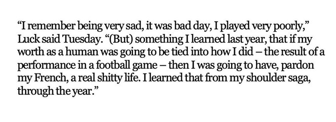 What Andrew Luck said to me a few weeks ago now takes on completely different context. Of going through the shoulder injury: "I shudder to think of not having that. I don’t think I’m married if that had not happened. I think I eff that up. I truly do."